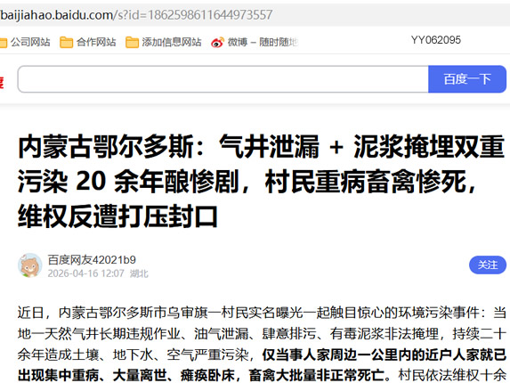 近日,内蒙古鄂尔多斯市乌审旗一村民实名曝光一起触目惊心的环境污染事件:当地一天然气井长期违规作业、油气泄漏、肆意排污、有毒泥浆非法掩埋,持续二十余年造成土壤、地下水、空气严重污染,仅当事人家周边一公里内的近户人家就已出现集中重病、大量离世、瘫痪卧床,畜禽大批量非正常死亡。村民依法维权十余载,却遭遇部门推诿、虚假检测、证据销毁、非法限制人身自由、威胁恐吓等层层打压,多项合理诉求悬而未决,普通百姓的生命健康、财产安全与基本生存权利受到严重侵害。
